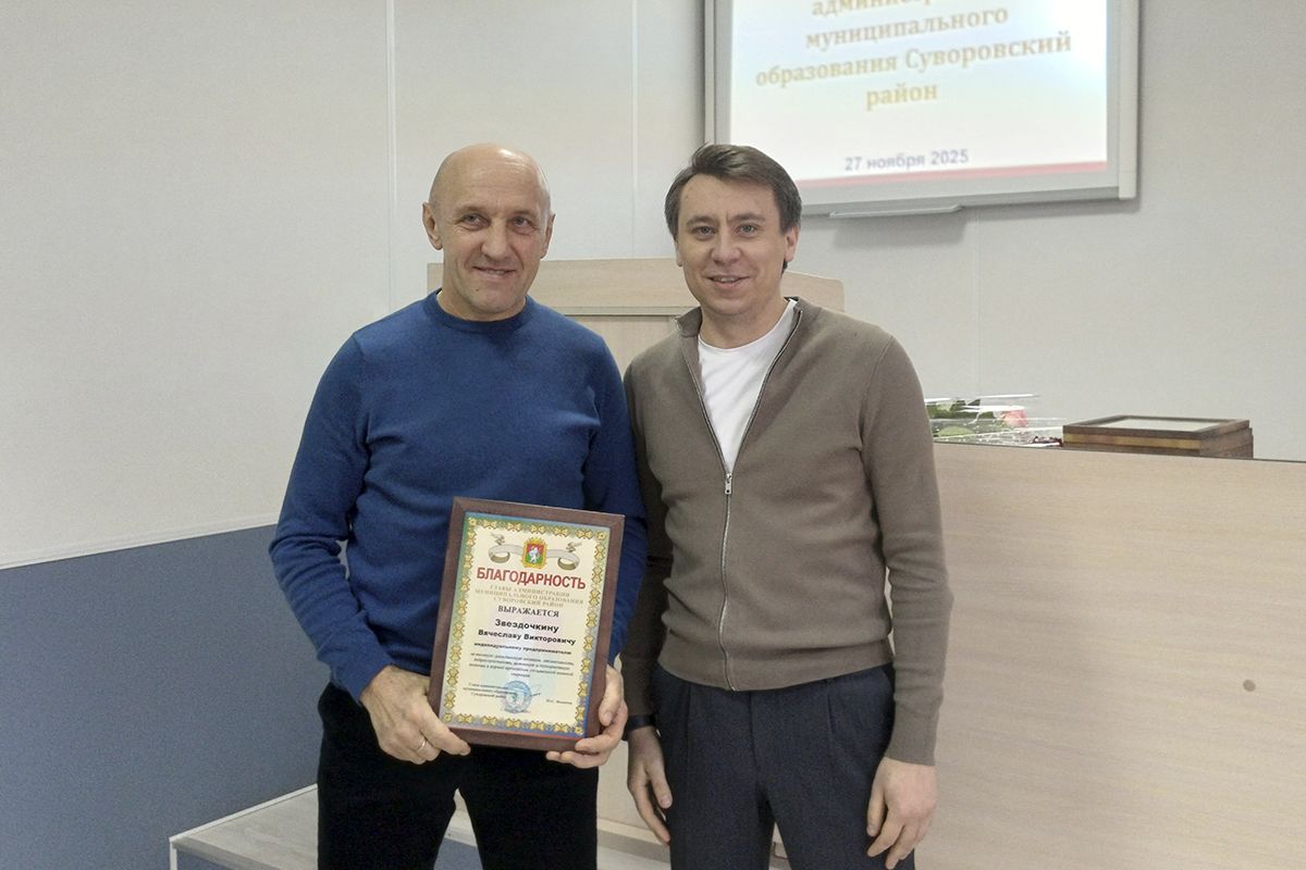 В Суворовском районе состоялось заседание Совета администрации. Началось оно с замечательного события – работа суворовских волонтёров, поддерживающих военнослужащих, участвующих в специальной военной операции, была отмечена Благодарностями главы районной администрации.