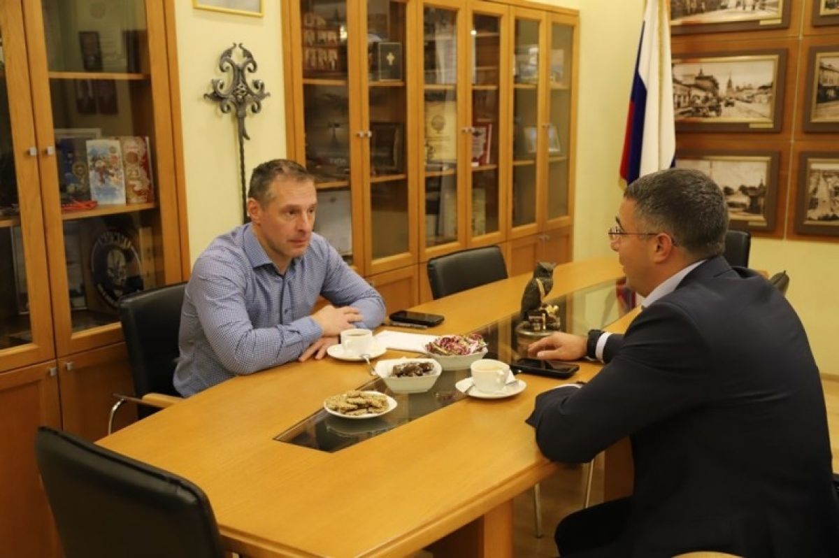Глава города Тулы Алексей Эрк вместе с наставляемым в рамках проекта «Герой 71» участником спецоперации Сергеем Красильниковым обсудили планы на второй этап стажировки.