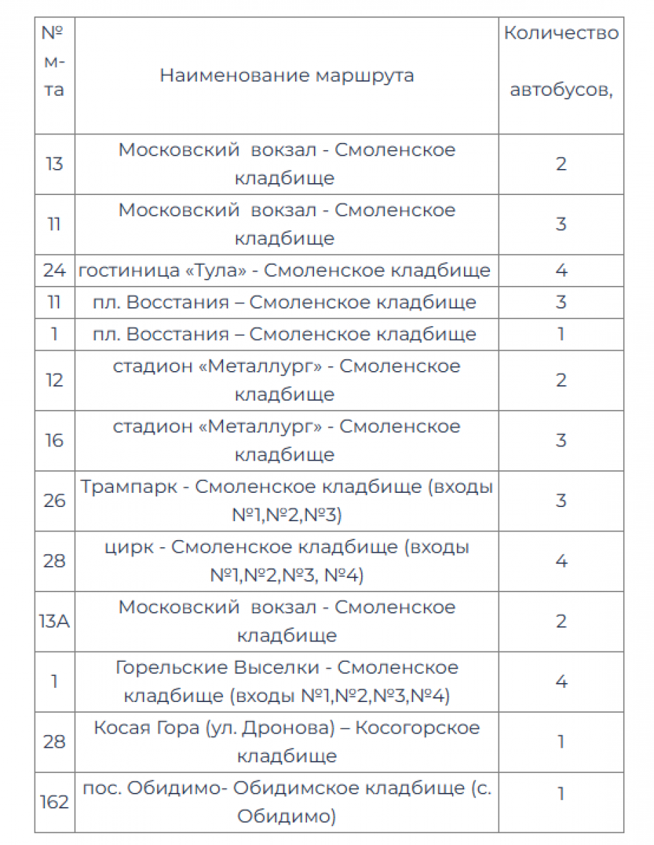 С 6 часов 30 минут и до 15 часов планируется организовать дополнительные рейсы до Смоленского кладбища и других мест захоронений. В перевозке туляков задействуют 33 автобуса. Все льготы на этом транспорте сохранены.