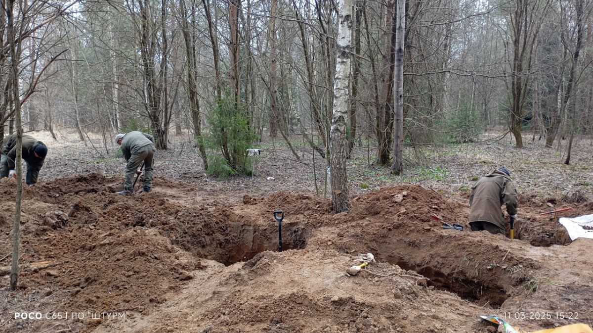 А дальше уже дело техники, выехали на место. Поле пахалось десятилетиями и, естественно, никаких ямок, холмиков, каких-то изменений ландшафта там увидеть было невозможно. Начали обрабатывать место поисковыми щупами. В одном месте щуп «упал», то есть легко прошел грунт. После 3-4 попыток удалось нащупать останки на глубине где-то порядка 90 сантиметров. Проверочные шурфы подтвердили наличие останков красноармейцев. После этого начали раскрывать ямы, делать археологическую зачистку и непосредственно приступать к эксгумации», - рассказал командир отряда «Штурм».