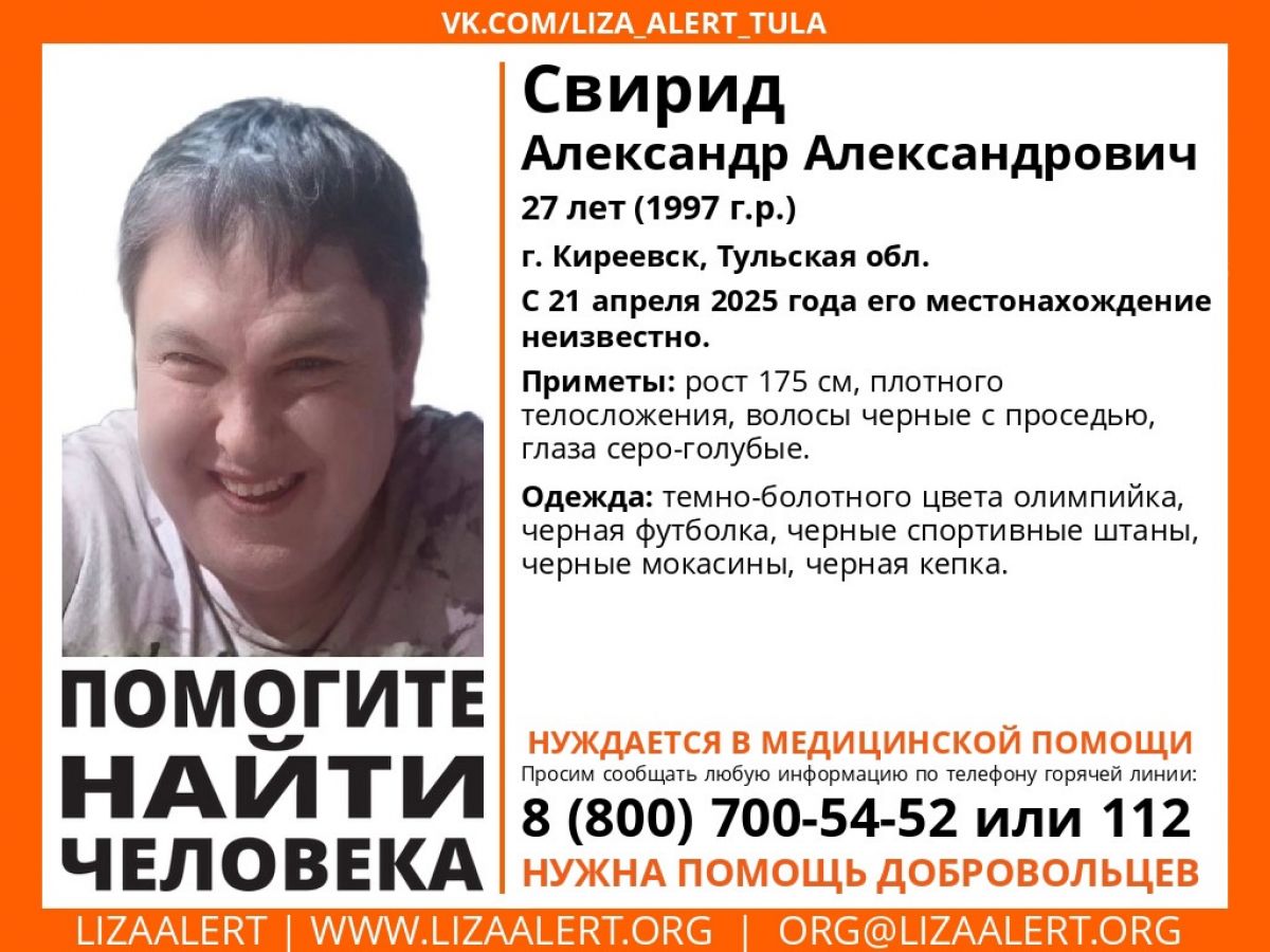 Местонахождение Александра Свирида неизвестно с 21 апреля. 27-летний житель Киреевска нуждается в медицинской помощи.