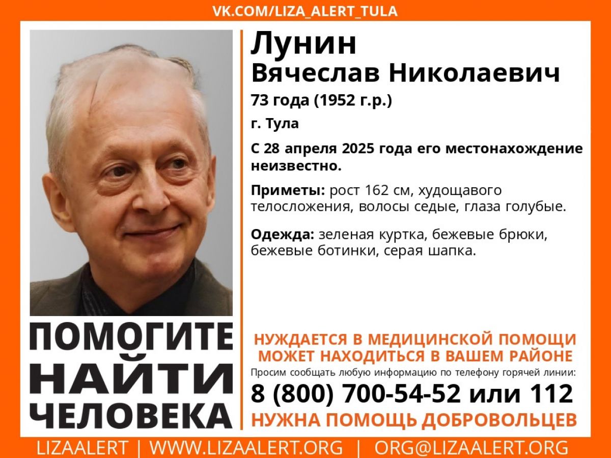 О поисках жителя Тулы, нуждающегося в медицинской помощи, сообщает отряд «ЛизаАлерт». 73-летний Вячеслав Лунин пропал сегодня, 28 апреля.