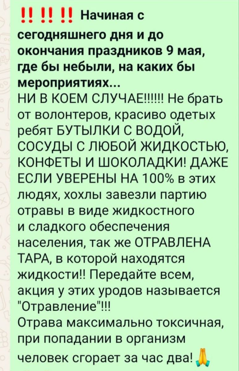 Похожее сообщение пришло еще одной нашей читательнице из Ясногорска. В данном случае опасными оказались не фляги, а обыкновенные бутылки с различными жидкостями, конфеты и шоколадки, которые раздают красиво одетые волонтеры. При этом зараза, которой якобы отравлены угощения, по словам создателей фейка, убивает человека за несколько часов.