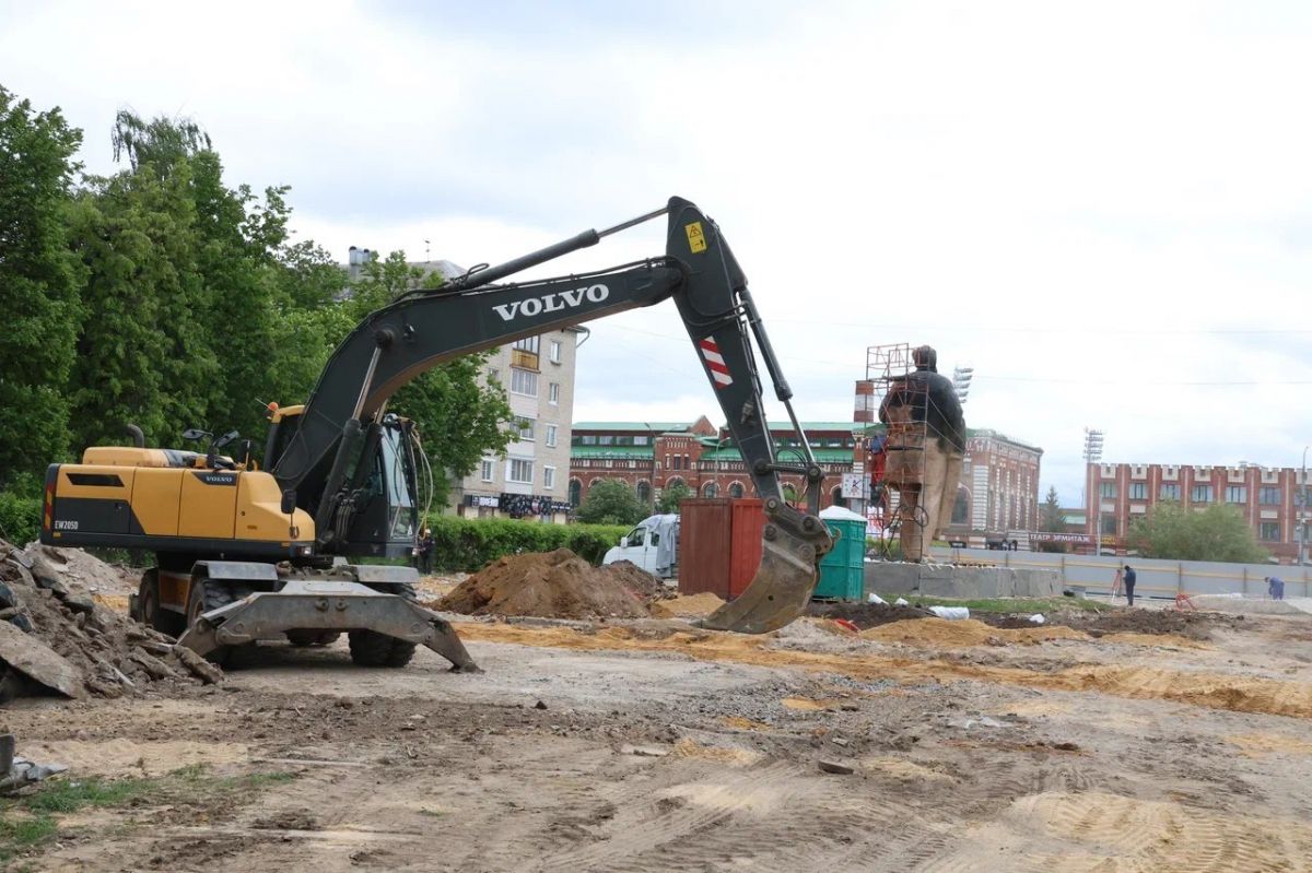 На данный момент в сквере полностью демонтированы плитка и ступени, фонтан и клумбы. С помощью строительной техники выравнивается основание, укладывается песчаная подушка.