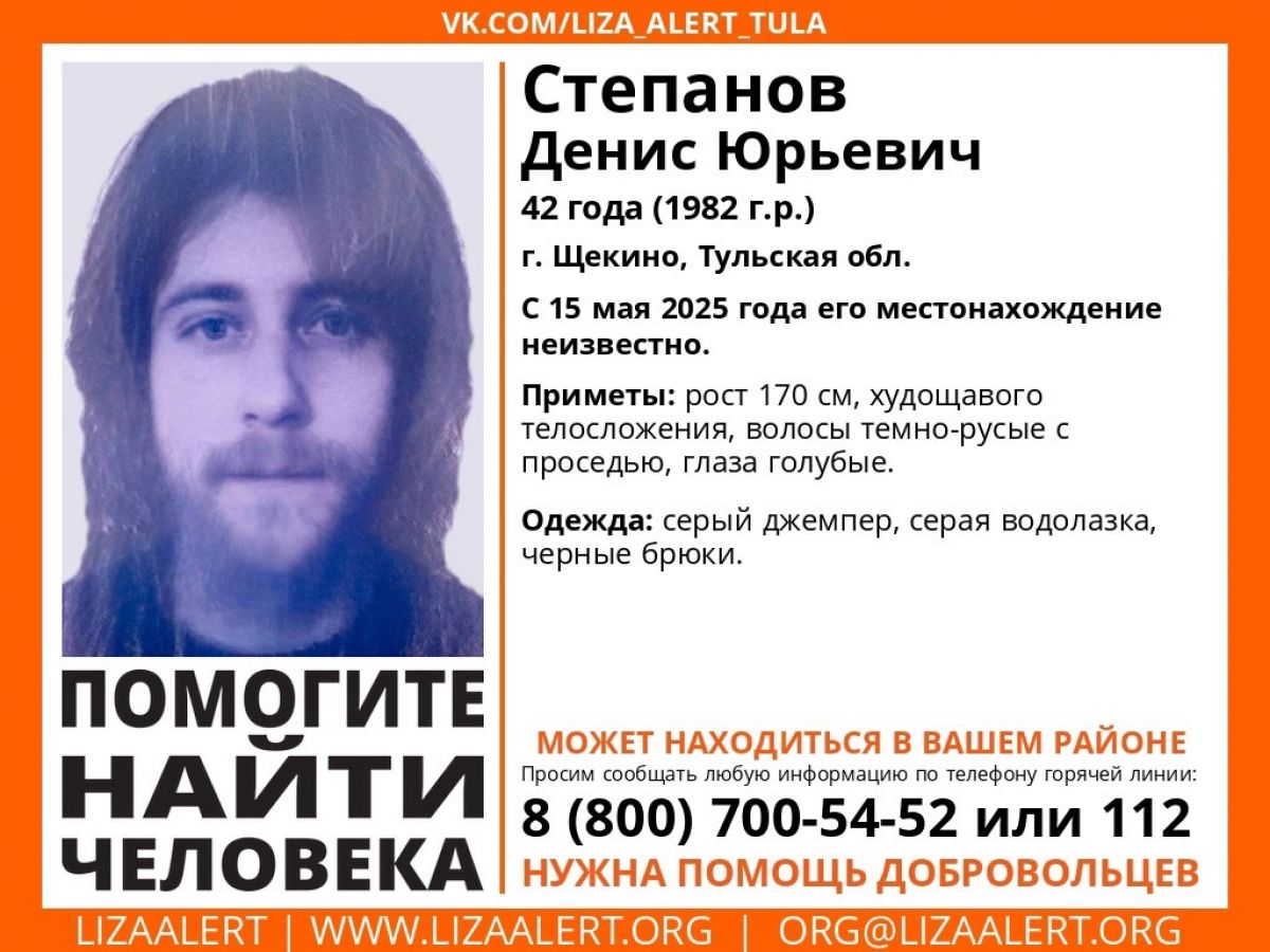 42-летний житель города Щекино Денис Степанов вышел из дома и не вернулся 15 мая. О его поисках сообщает отряд «ЛизаАлерт».