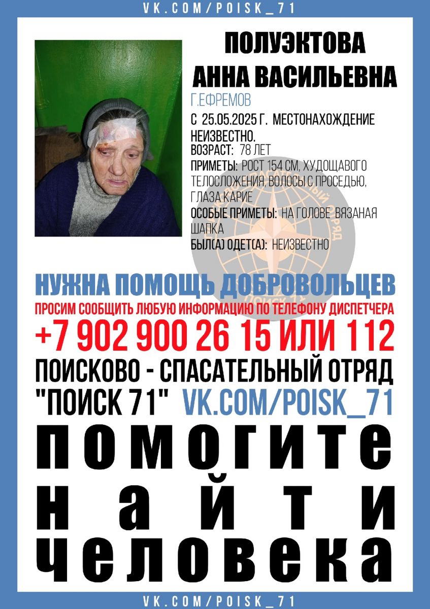 78-летняя Анна Полуэктова, жительница города Ефремова, пропала 25 мая. Об этом сообщают волонтеры добровольческого поисково-спасательного отряда «Поиск 71».
