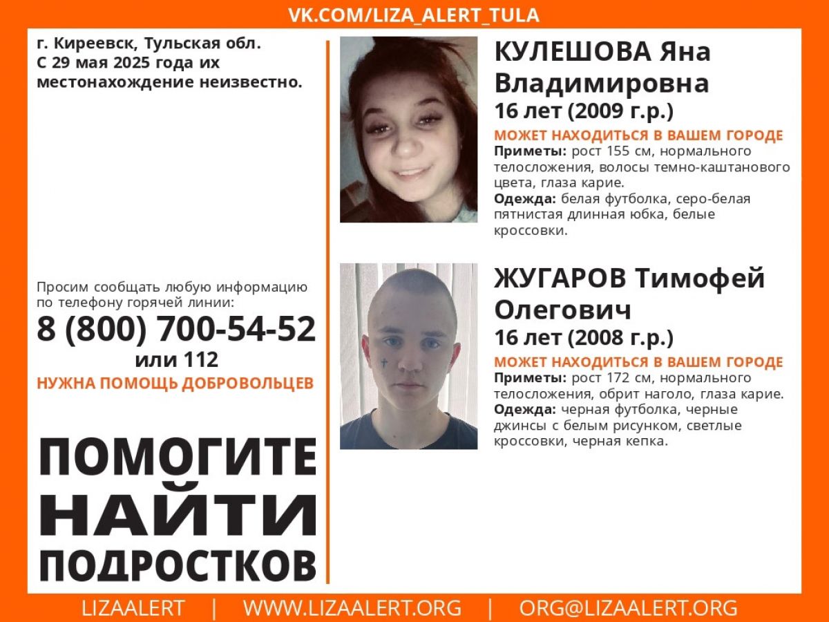 Местонахождение 16-летних жителей города Киреевска Яны Кулешовой и Тимофея Жугарова неизвестно с 29 мая.