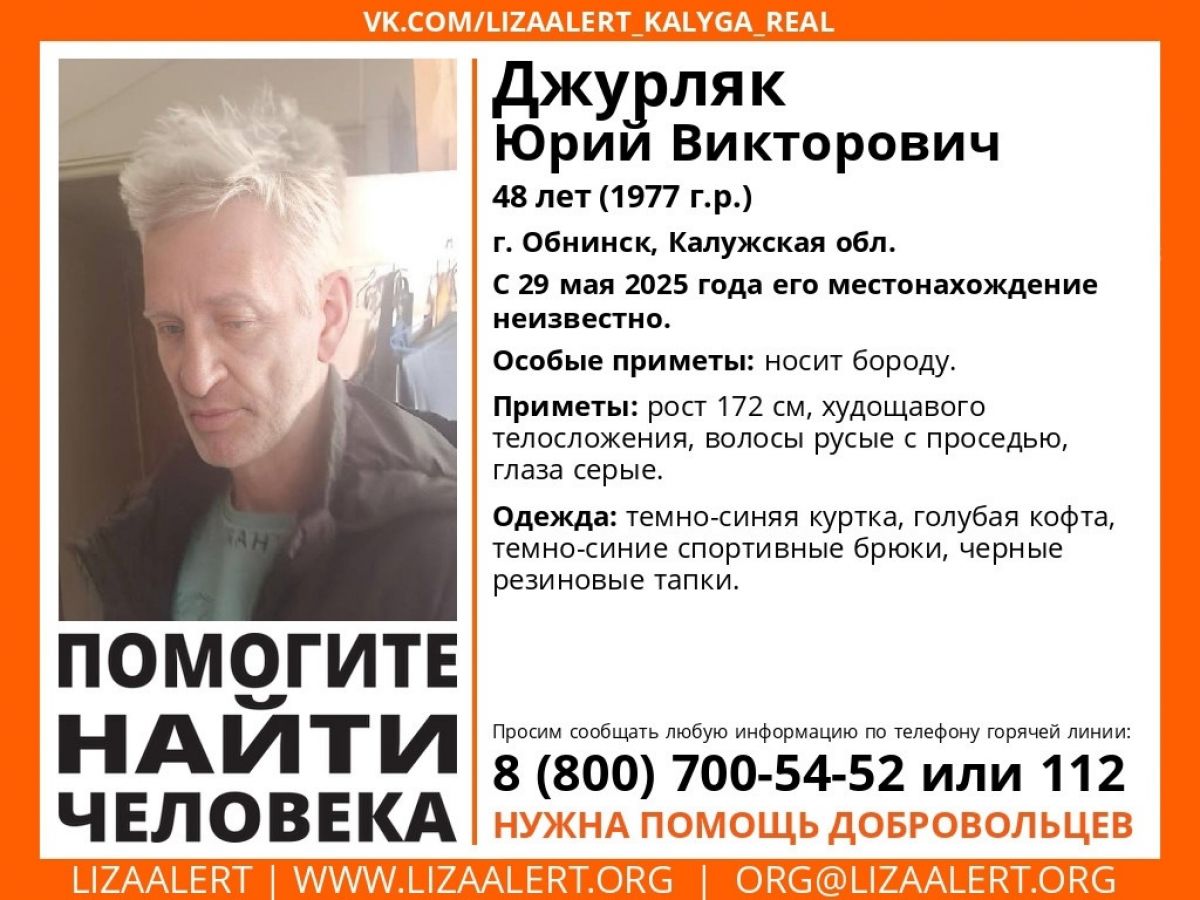 Активисты поискового отряда «Лиза Алерт» считают, что 48-летний Юрий Джурляк может находиться в Тульской области.