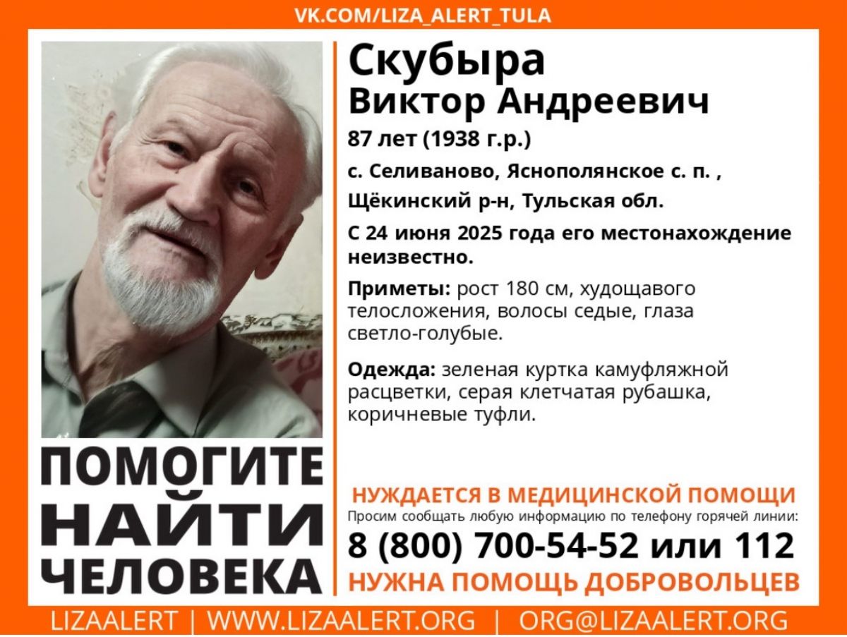 О поисках 87-летнего Виктора Скубыра, жителя села Селиваново Щекинского района, сообщает отряд «ЛизаАлерт». Накануне пенсионер ушел в лес, до сих пор его местонахождение неизвестно.