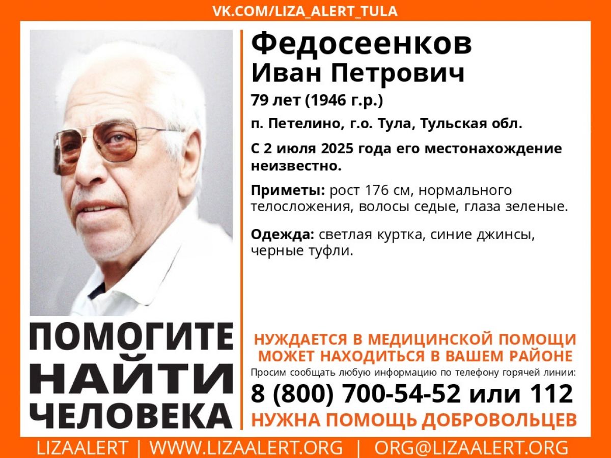 Иван Федосеенков, 79-летний житель поселка Петелино городского округа Тула, пропал 2 июля. Мужчина нуждается в медицинской помощи. О его поисках сообщает отряд «ЛизаАлерт».