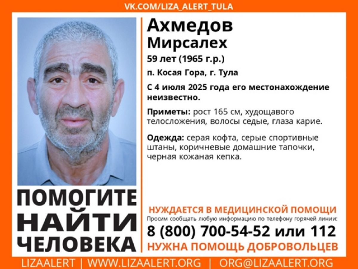 Местонахождение Мирсалеха Ахмедова неизвестно с 4 июля, когда он не вернулся домой. О поисках 59-летнего жителя поселка Косая Гора сообщает отряд «ЛизаАлерт».