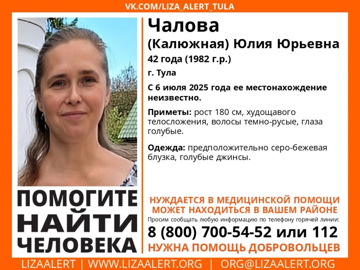 Местонахождение Юлии Чаловой (Калюжной) неизвестно с 6 июля. О поисках 42-летней жительницы Тулы сообщает отряд «ЛизаАлерт».