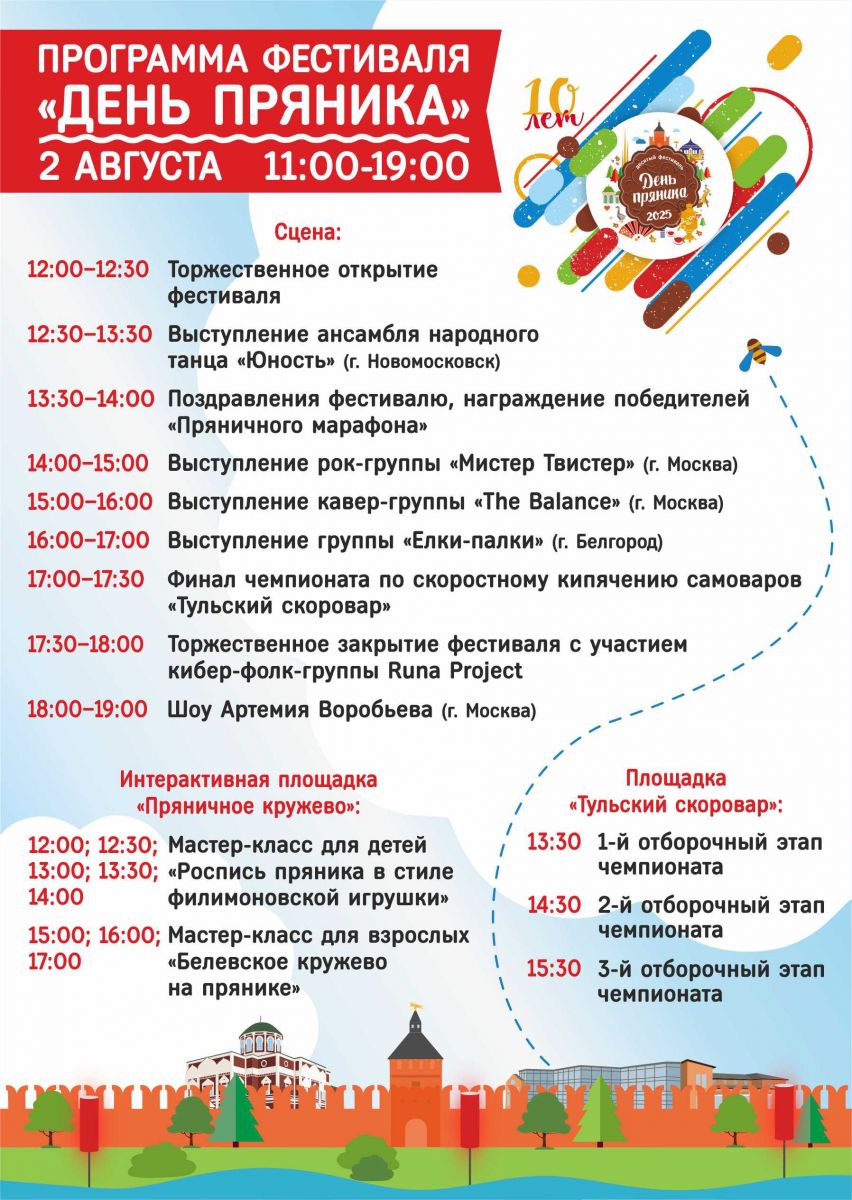 2 августа на территории Тульского кремля состоится Х Всероссийский фестиваль «День пряника». Организатор фестиваля – Объединение центров развития культуры Тульской области – приготовил для гостей масштабную программу с обилием тематических площадок, интерактивных программ, конкурсов и затей, разнообразием концертных выступлений, торговых рядов и фотозон.