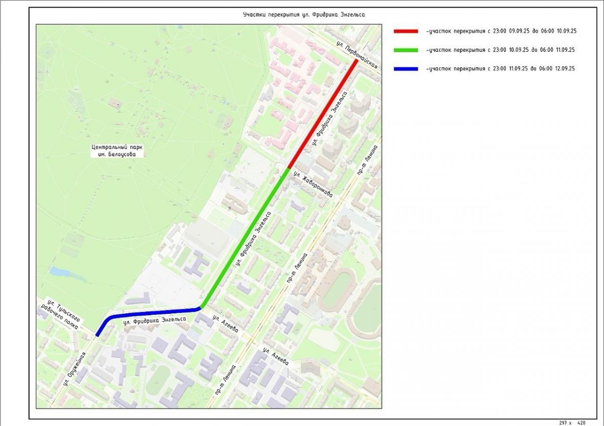 С 9 по 12 сентября ограничение движения на улице Фридриха Энгельса будут вводиться на разных участках дороги, сообщает региональное министерство транспорта и дорожного хозяйства.