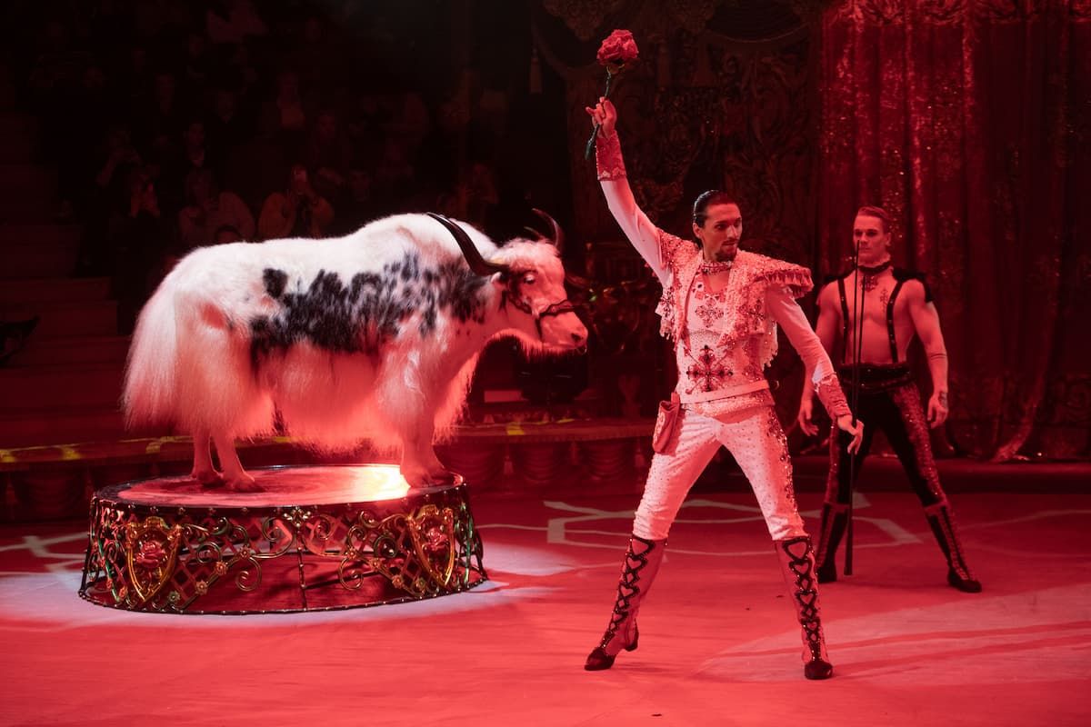 Каждое выступление на манеже - настоящий мини-спектакль. Коррида. Зрители замерли, ведь они ожидают, что сейчас появятся животные. Но кто именно и какие они? Звездами этого номера стали пять горделивых яков. Великолепная дрессура животных, задействованных в представлении позволила продемонстрировать их талант, грацию и естественное обаяние.