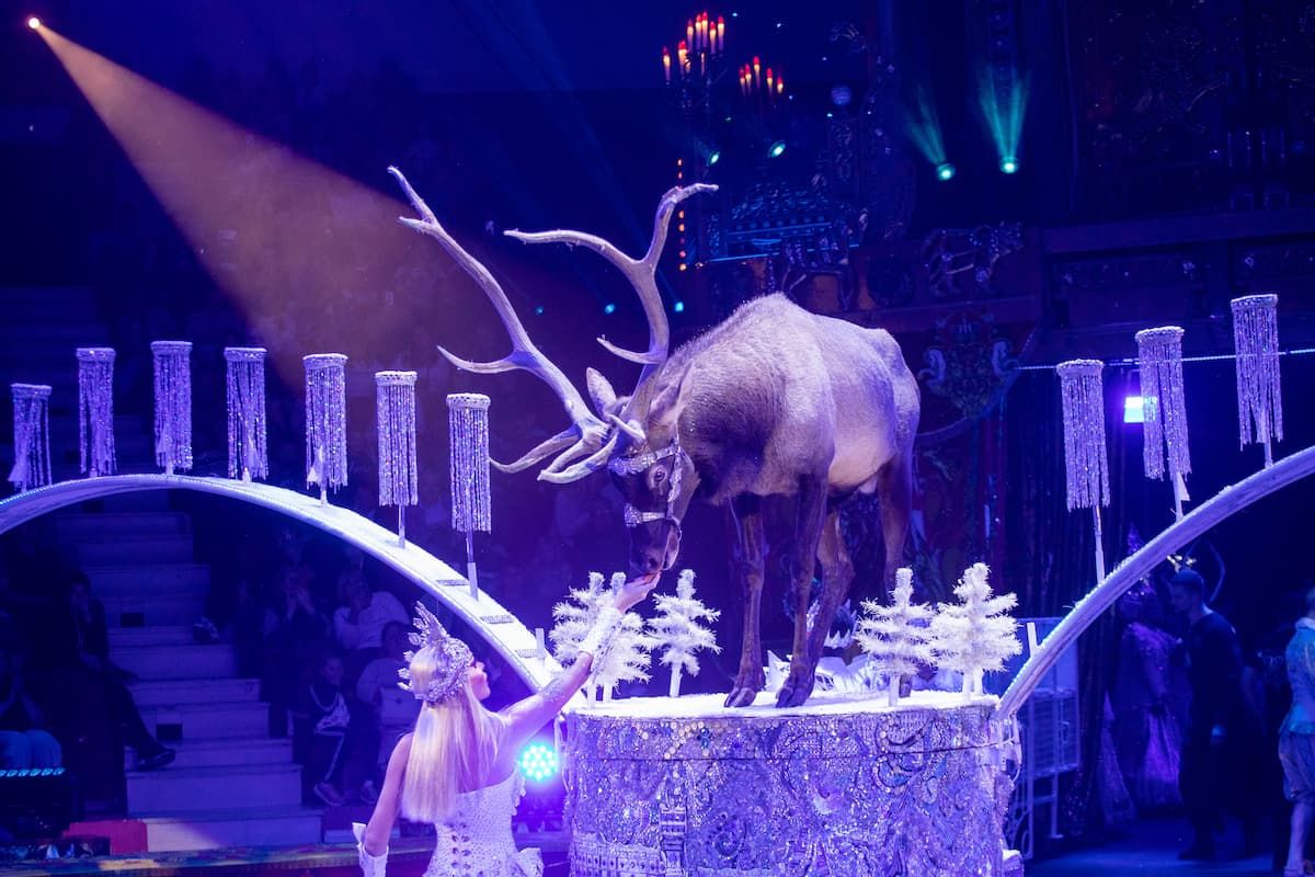 Не оставил без аплодисментов и оваций номер с зимней сказкой, который очарованный зритель смотрел с замиранием сердца. Манеж на несколько минут стал просто сказочным: изящные танцовщицы под симфонию Чайковского показали мастерство хореографии, а в качестве одного из элементов костюма был потрясающей красоты кокошник, сверкавший алмазами. Как в русской зимней сказке, как-будто по волшебству, перед зрителями появлялись во всей своей красе и олени - северные и благородные лесные, и лисы, и русские борзые.