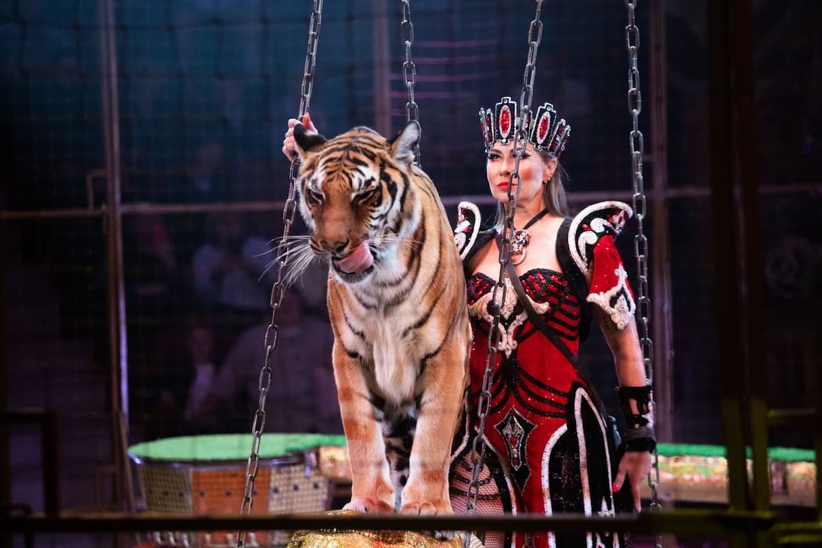 После антракта зрители вернулись в обновленный манеж - высокая клетчатая ограда, девять высоких тумб для животных. На арене появляются артисты в костюмах времен древнего Египта, а над ними висит Сфинкс. На манеже - заслуженная артистка РФ, «Принцесса цирка», дрессировщица хищников Людмила Суркова, а следом за ней по широким вольерам мягкой поступью с величественной грацией вступают тигры. Каждый уже знает свое место и их Принцесса лишь легким жестом подсказывает нужное действие. Непринужденность, легкость и взаимопонимание - именно это происходило на арене цирка, когда выступали большие кошки.