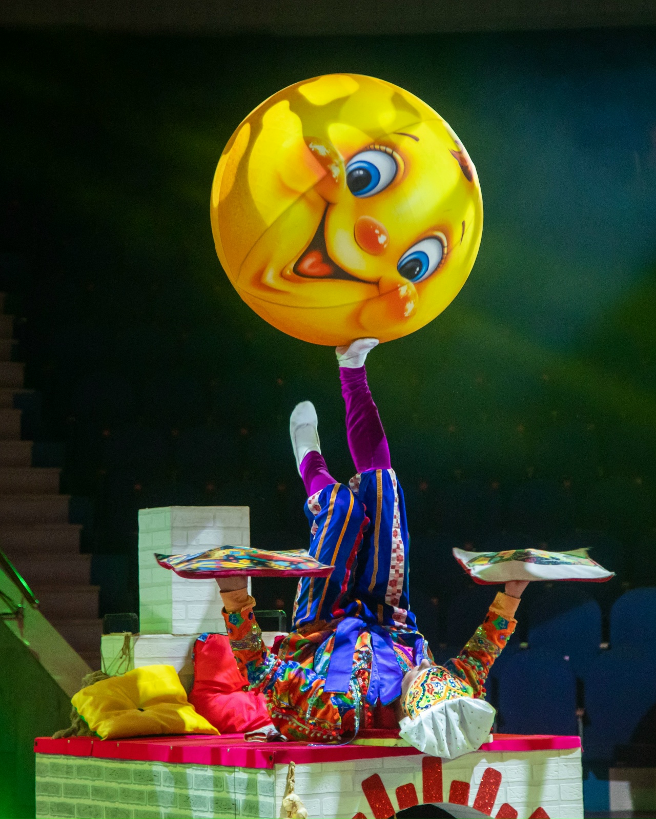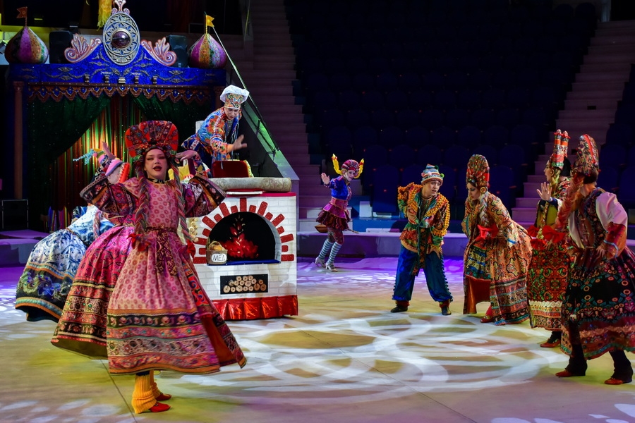 Занавес открывается, и на манеж выезжает сам Емеля, роль которого исполняет эквилибрист Александр Куренис. Едет он, как и подобает канону сказки, на настоящей русской печке. Емеля ленится, не хочет слезать с удобного лежбища, а потому трюки исполняет лежа. Простота, с которой он жонглирует, обманчива: такая легкость движений нарабатывается только десятилетиями упорной практики.