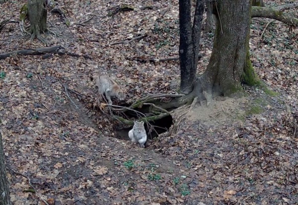 Редкими кадрами поделились сотрудники заповедника «Калужские засеки». Мама-рысь с двумя упитанными котятами резвились у своего логова.
