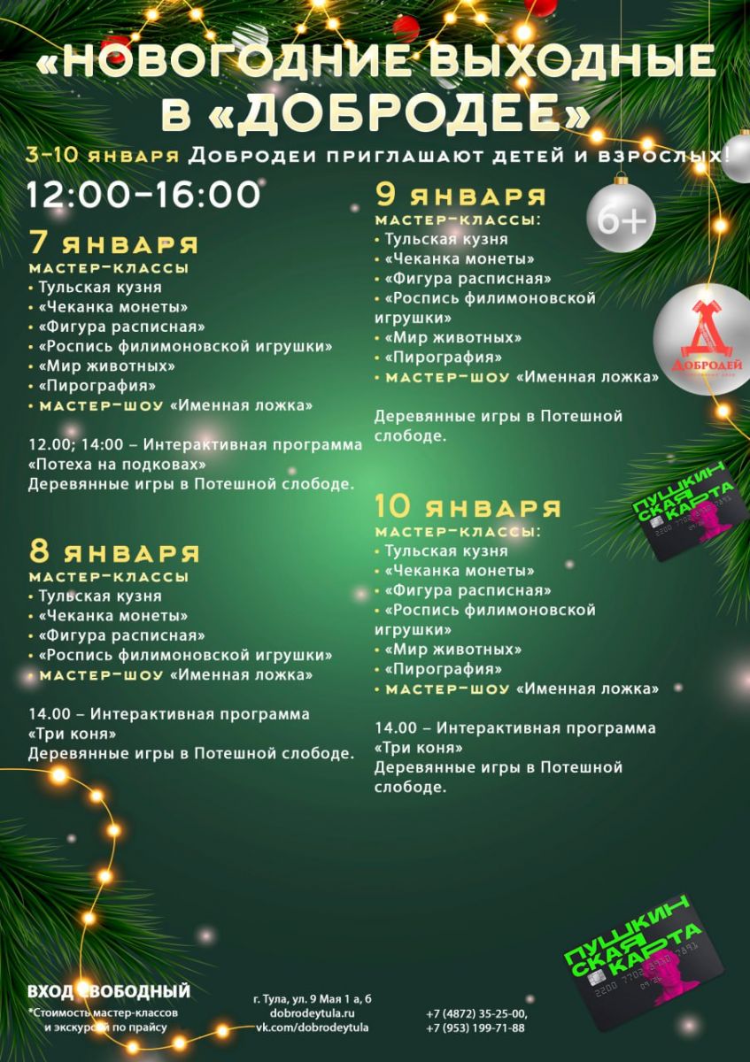 С 3 по 10 января в ремесленном дворе «Добродей» пройдут «Новогодние выходные» для туляков и гостей оружейной столицы всех возрастов. Они проводятся в рамках регионального проекта «Музейная зима в Туле».