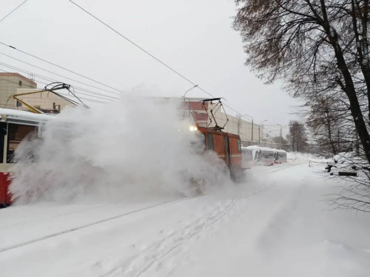 Спецтехника расчищает трамвайные пути в Туле