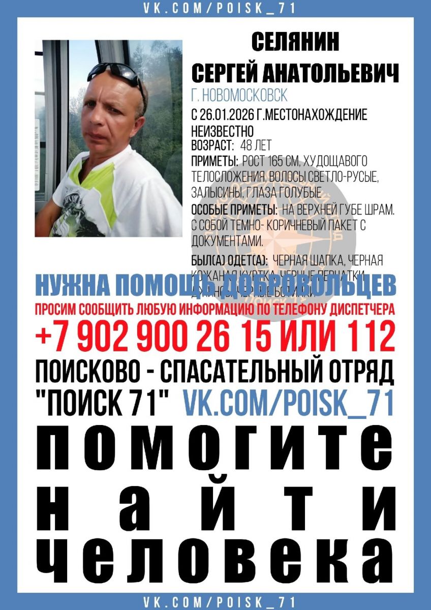Добровольцы поисково-спасательного отряда «Поиск 71» сообщают о пропавшем 48-летнем жителе Новомосковска Сергее Селянине.