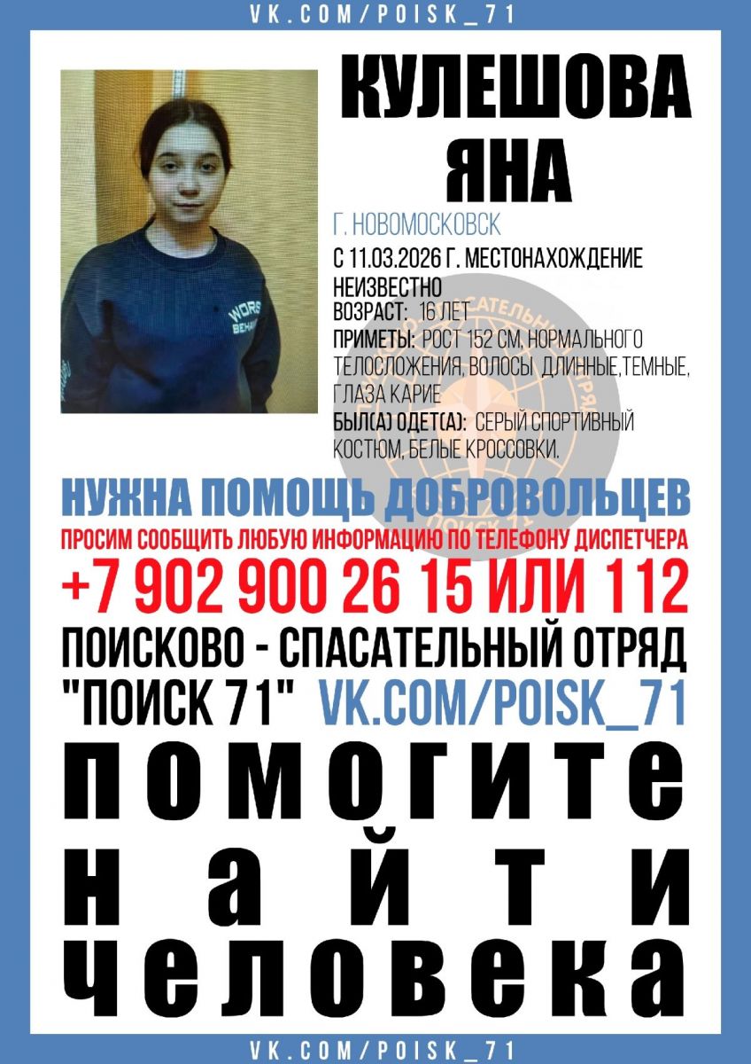 По данным добровольческого поисково-спасательного отряда «Поиск 71», 16-летняя Яна Кулешова, жительница города Новомосковска Тульской области, пропала накануне 11 марта.
