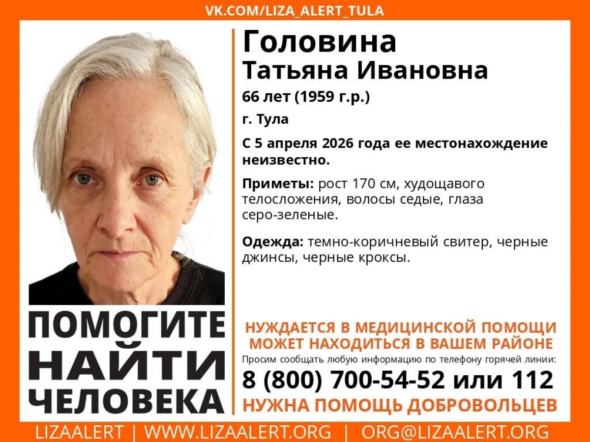Как сообщают добровольцы отряда «ЛизаАлерт», 66-летняя жительница Тулы Татьяна Головина пропала 5 апреля.