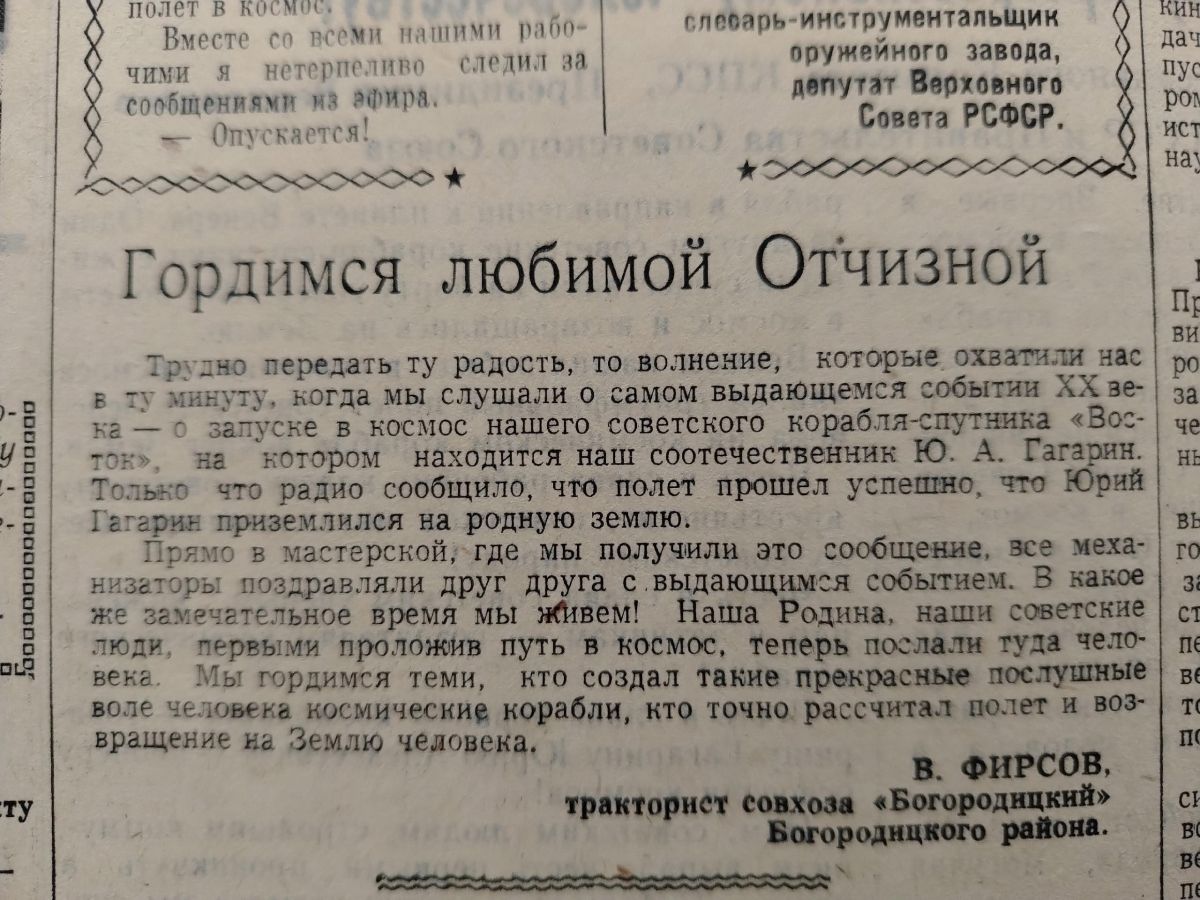 Первый полет человека в космос жители Тульской области приняли с восторгом. Отзывы земляков на историческое событие публиковались в периодике 1961 года в течение месяца. Ему посвящали репортажи, заметки и даже стихи, в которых выражали надежду на дальнейшее освоение просторов вселенной.