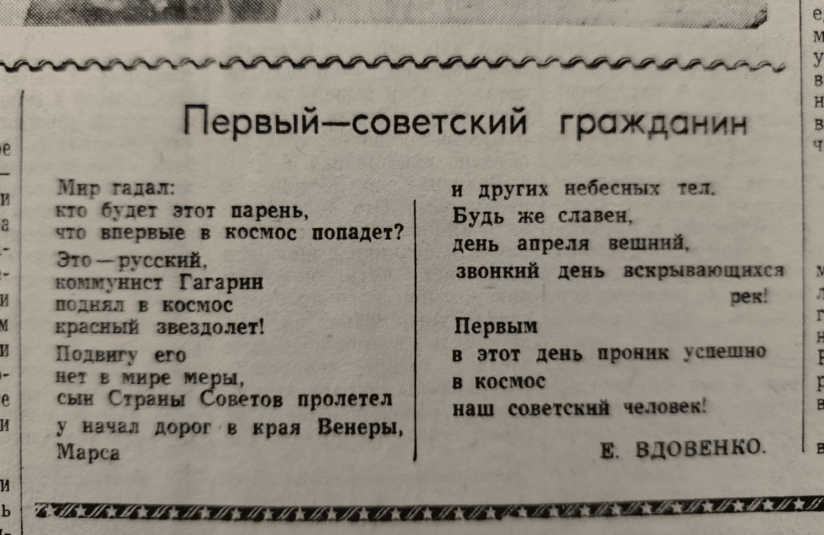 В тот самый день, 12 апреля, услышав сообщение Левитана о человеке в космосе, молодые и пожилые обнимались, кричали «ура», выходили на митинги и поздравляли друг друга. Разговоры по телефону в этот день были полны восторга и ликования. Ведь Юрий Гагарин воплотил мечту многих о прекрасном космосе и светлом будущем.
