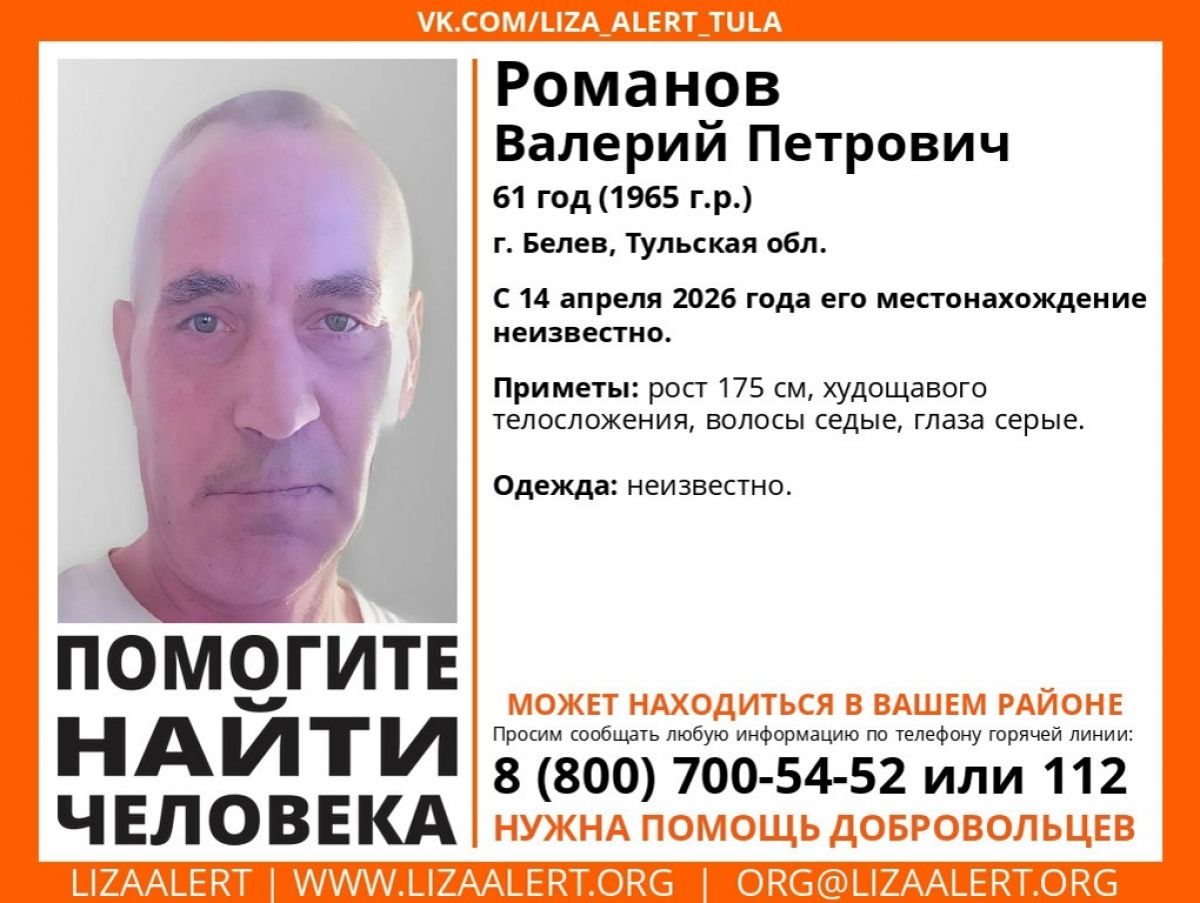 Местонахождение Валерия Романова, 61-летнего жителя города Белева Тульской области, неизвестно с 14 апреля.