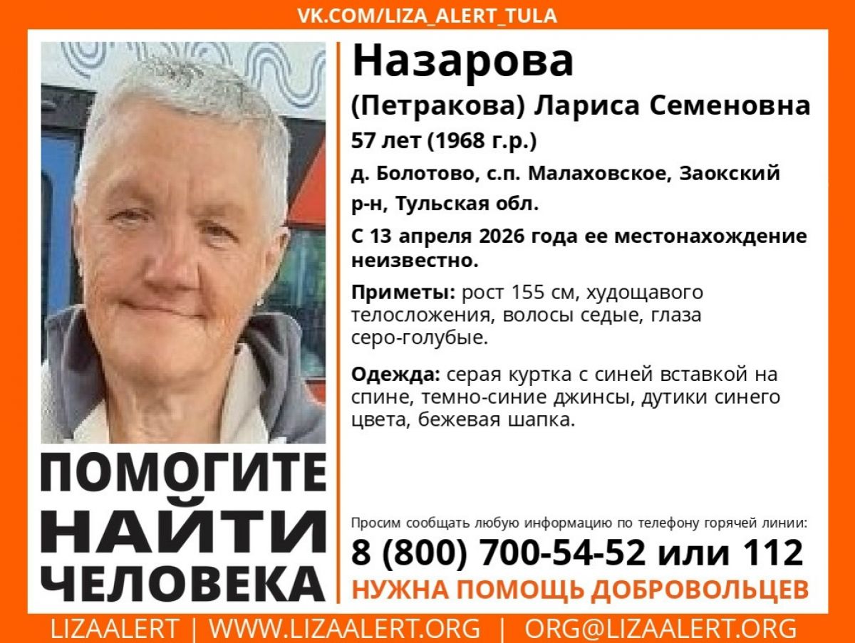 По данным отряда «ЛизаАлерт», местонахождение 57-летней Ларисы Назаровой (Петраковой), жительницы деревни Болотово, с.п. Малаховское Заокского района Тульской области неизвестно с 13 апреля.